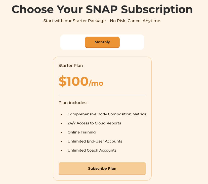 Currently, 1 plan is offered which is the SNAP Starter Plan at $100USD/month.